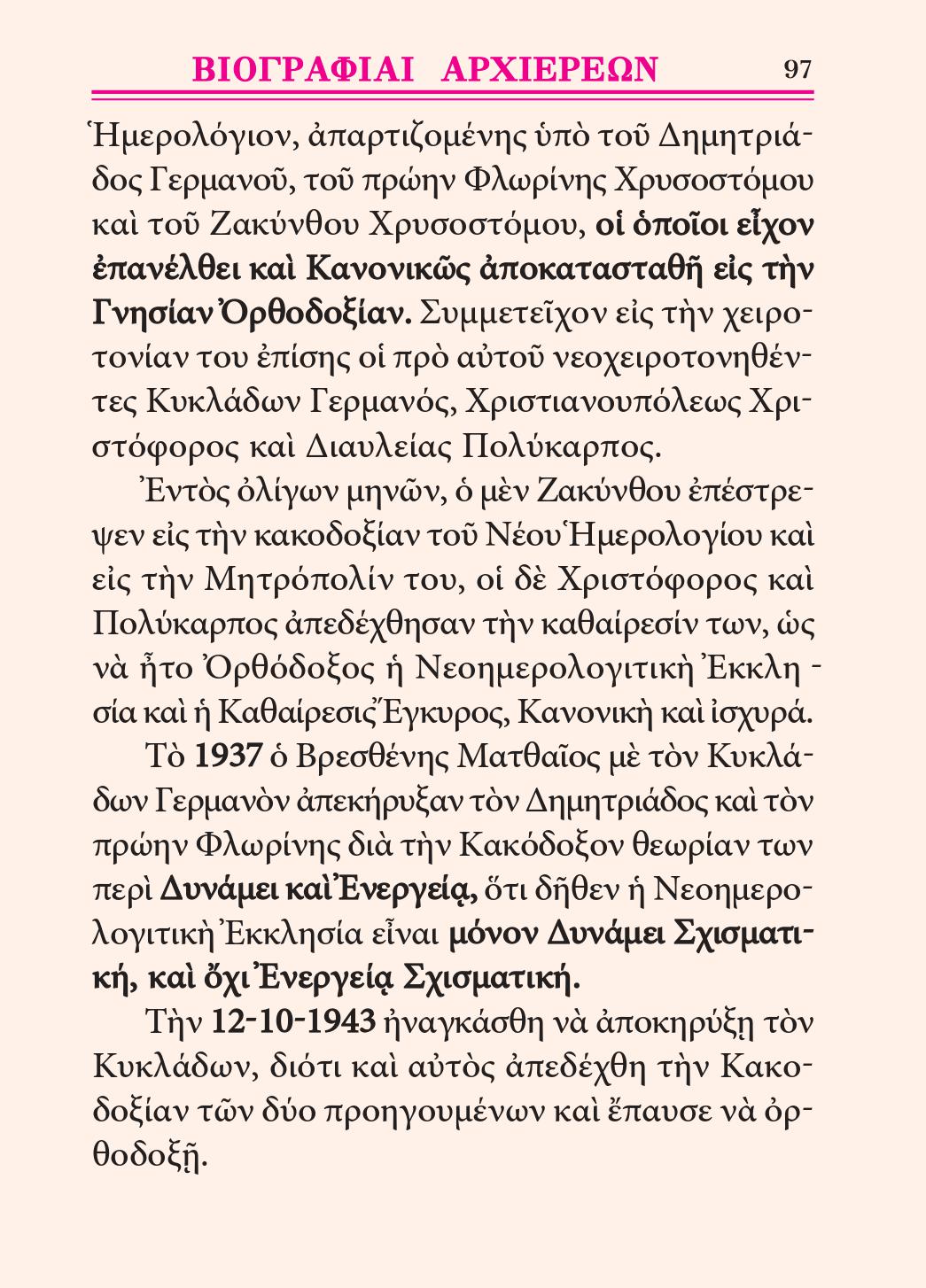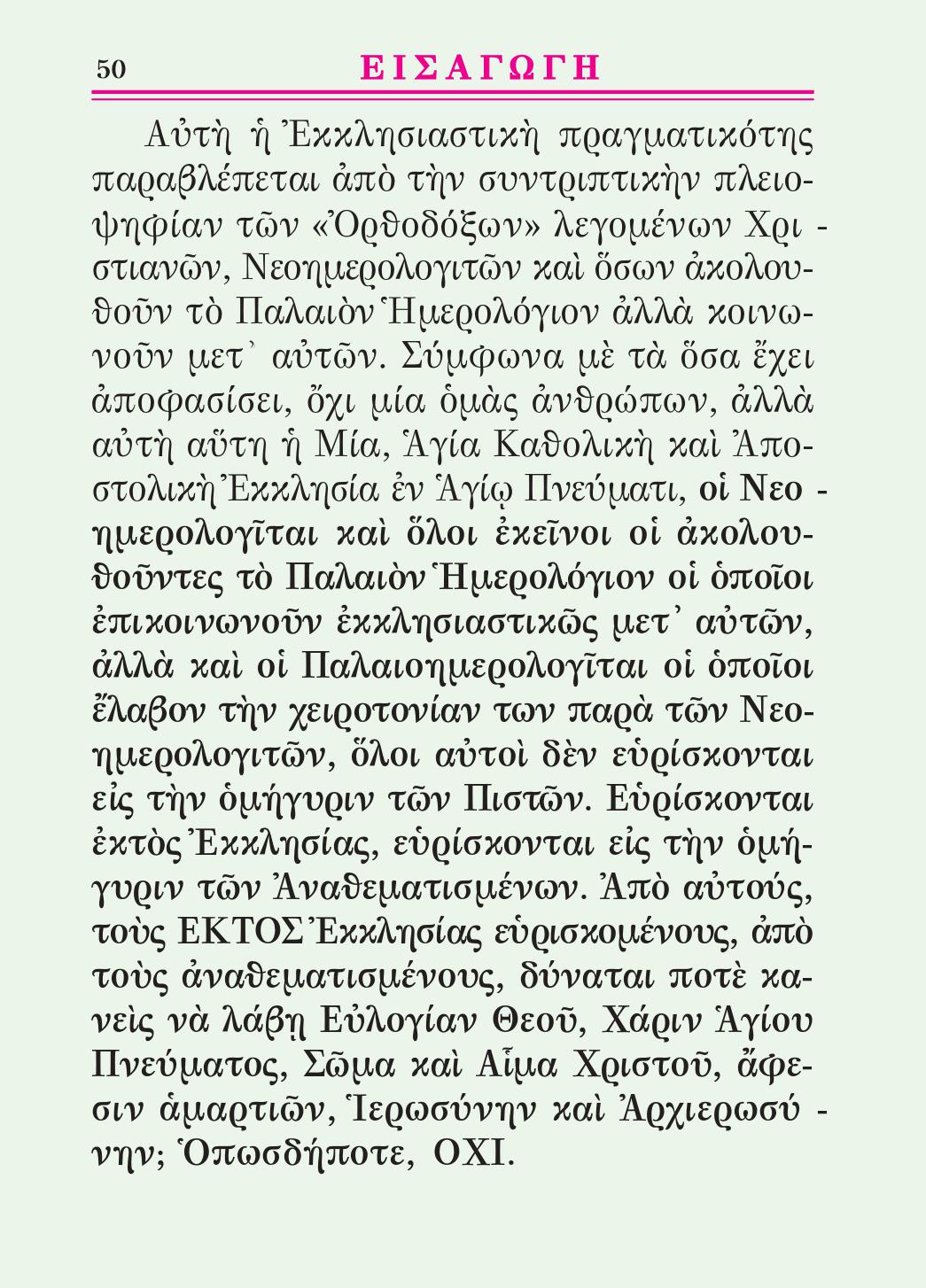 Eἰς τοὺς ἀπὸ τοῦ Ἀειμνήστου Ἐπισκόπου Βρεσθένης ΜΑΤΘΑΙΟΥ Α’ Καρπαθάκη ἕλκοντας τὴν ΑΠΟΣΤΟΛΙΚΗΝ ΠΙΣΤΙΝ καὶ τὴν ΑΠΟΣΤΟΛΙΚΗΝ ΔΙΑΔΟΧΗΝ Ἀρχιερεῖς τῆς Ἐκκλησίας τῶν Γνησίων Ὀρθοδόξων Χριστιανῶν τῆς Ἑλλάδος, τοὺς μὴ δεξαμένους τὴν καινοτομίαν τοῦ Νέου Παπικοῦ Γρηγοριανοῦ Ἡμερολογίου (τοῦ ἀπ᾽ αἰώνων Καταδικασθέντος καὶ Ἀναθεματισθέντος Πανορθοδόξως πολλάκις ὑπὸ τῆς Ὀρθοδόξου Ἐκκλησίας τοῦ Θεοῦ, τὸ ὁποῖον ἐσχάτως ἐπέβαλεν ἡ Ἑβραιοσιωνιστικὴ Μασονία), καθὼς καὶ τοὺς ἀποκηρύξαντας πᾶσαν ἐκκλησιαστικὴν κοινωνίαν μετὰ τῶν δεχομένων αὐτὸ καὶ μετὰ πάντων τῶν κοινωνούντων αὐτοῖς.