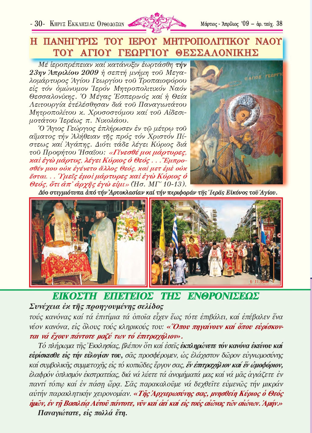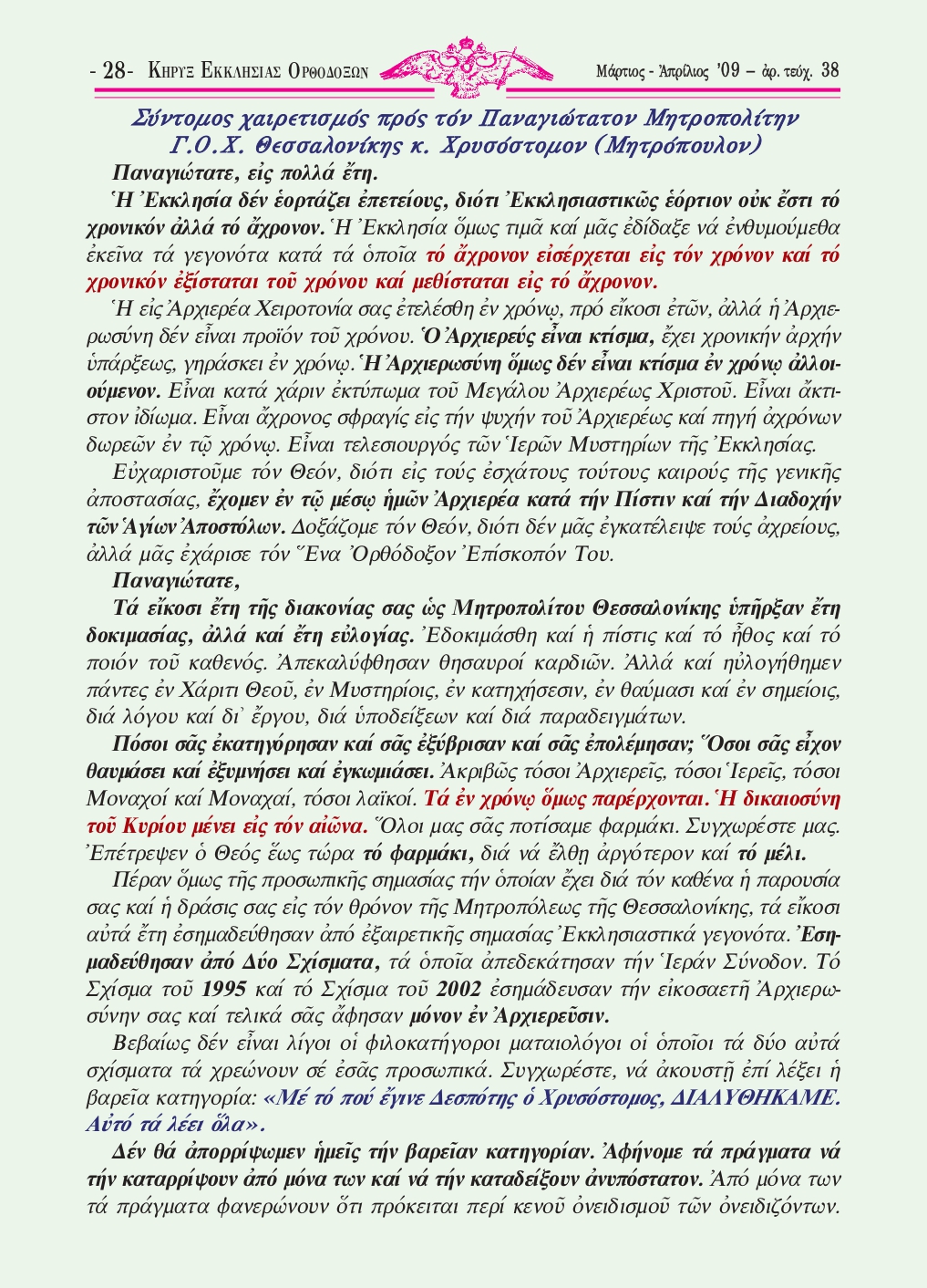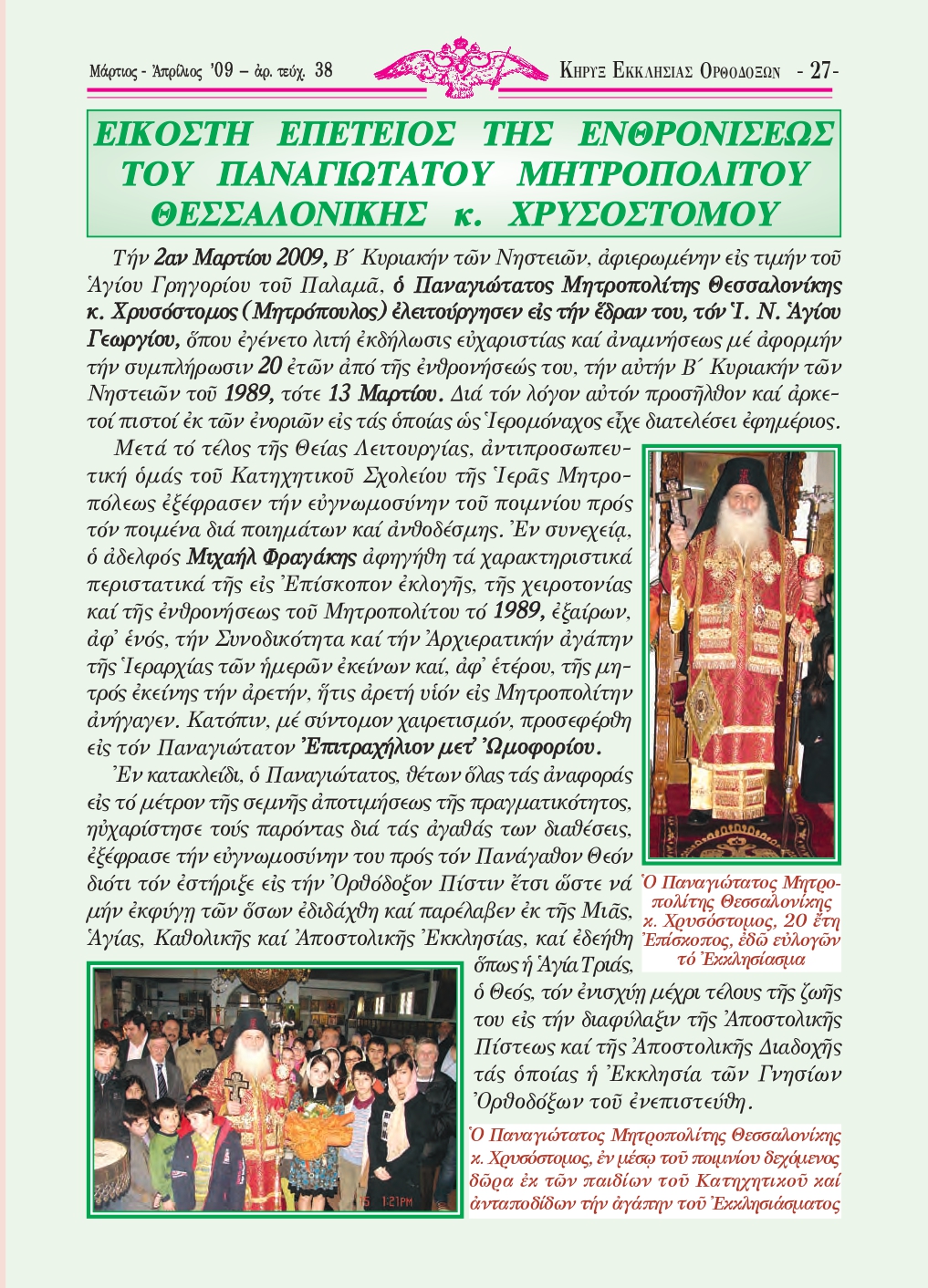 ‒ Εἰκοστὴ ἐπέτειος τῆς Ἐνθρονίσεως τοῦ Παναγιωτάτου Μητροπολίτου Θεσσαλονίκης κ. Χρυσοστόμου